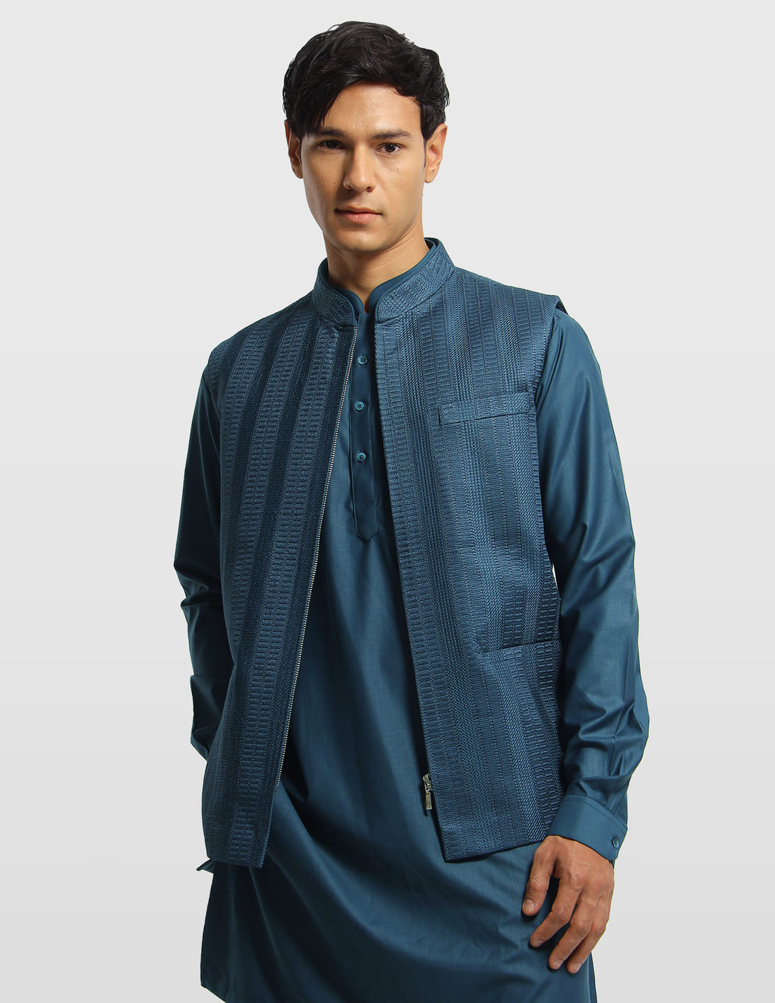 Embroidered Dobby Kurta Waistcoat Trouser Ethnic Set