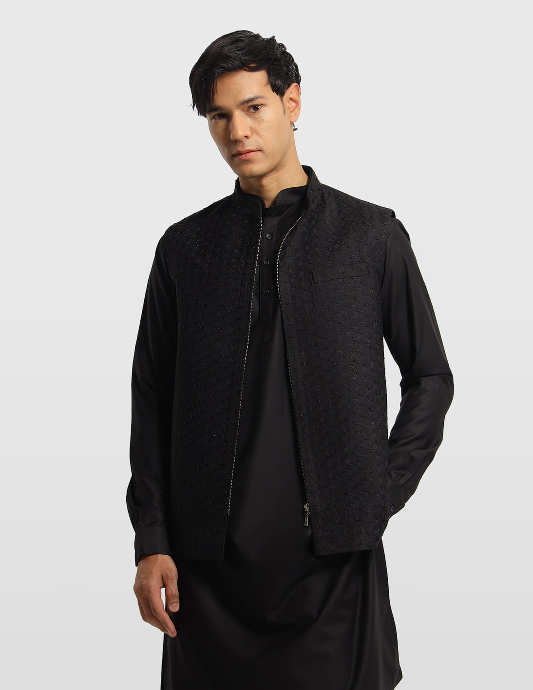 Geometric Embroidered Kurta Waistcoat Ethnic Set