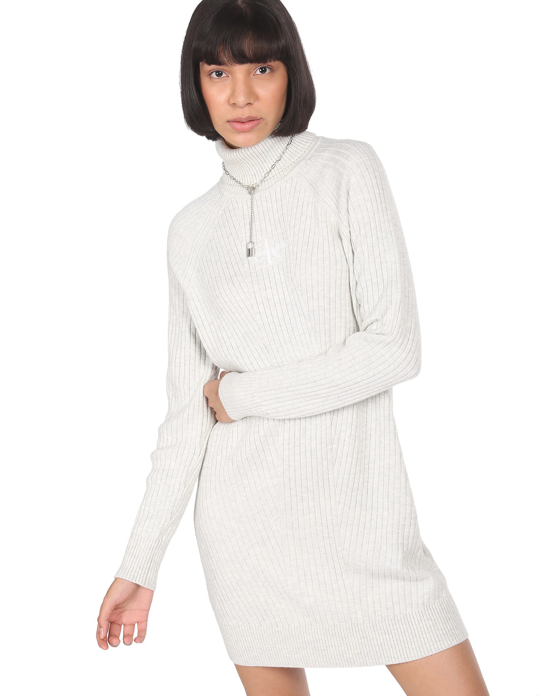 Women Light Grey Turtle Neck Monogram Sweater Dress