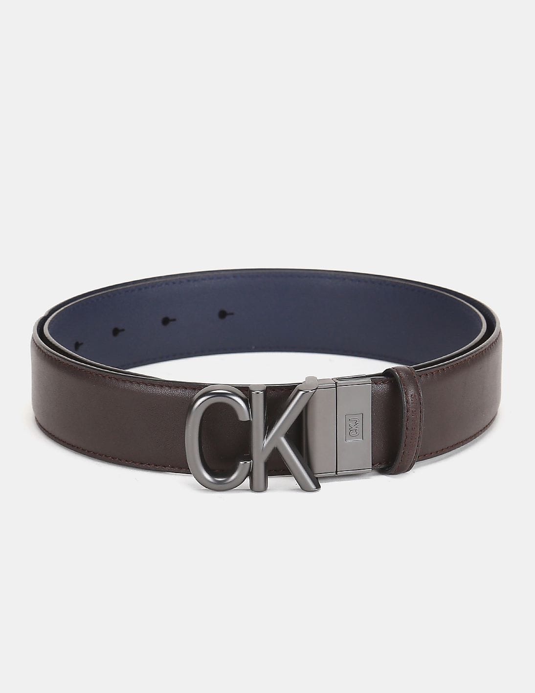 Men Bitter Brown And Navy Reversible Monogram Buckle Leather Belt