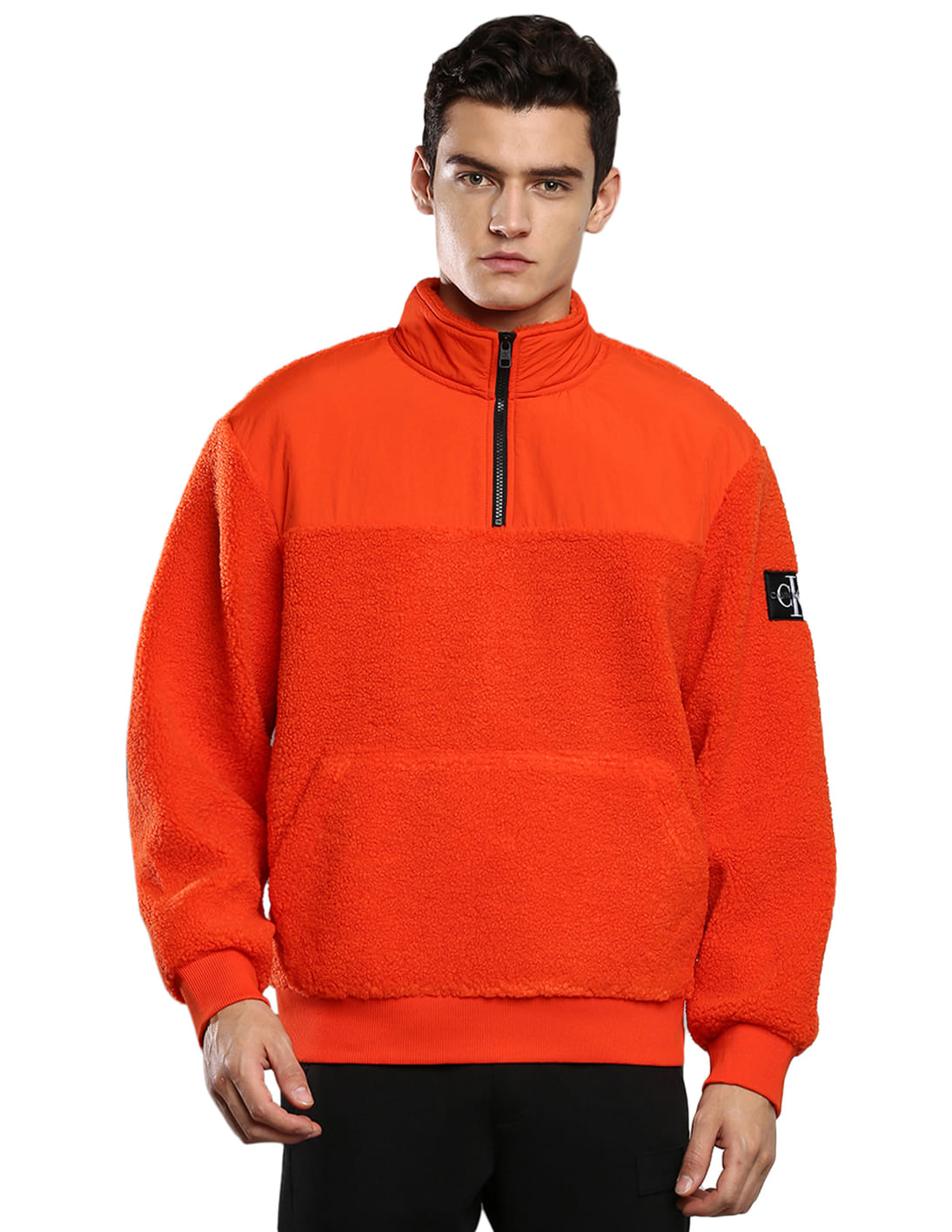 Men Orange Sherpa Short Zip Sweatshirt