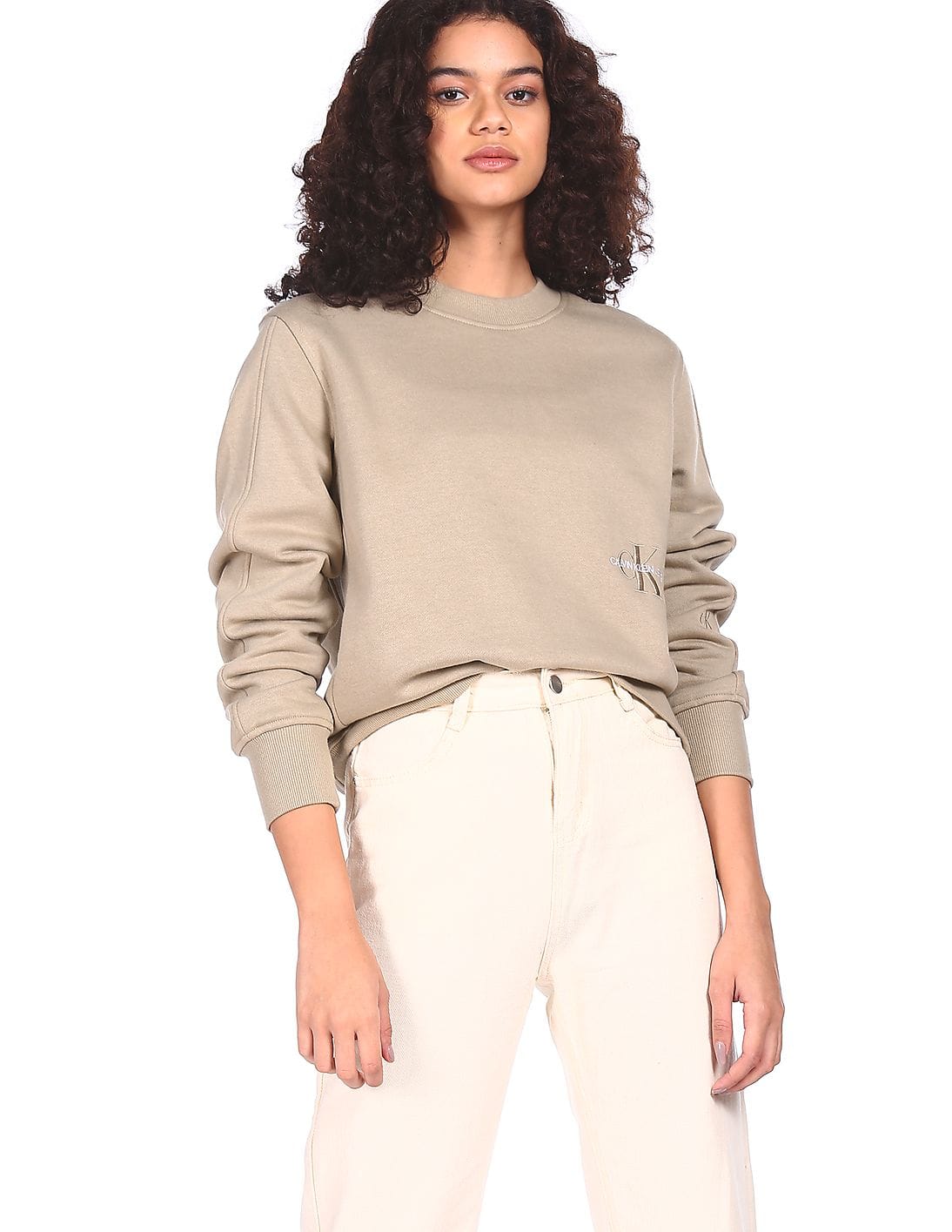 Women Beige Crew Neck Brand Embroidered Sweatshirt