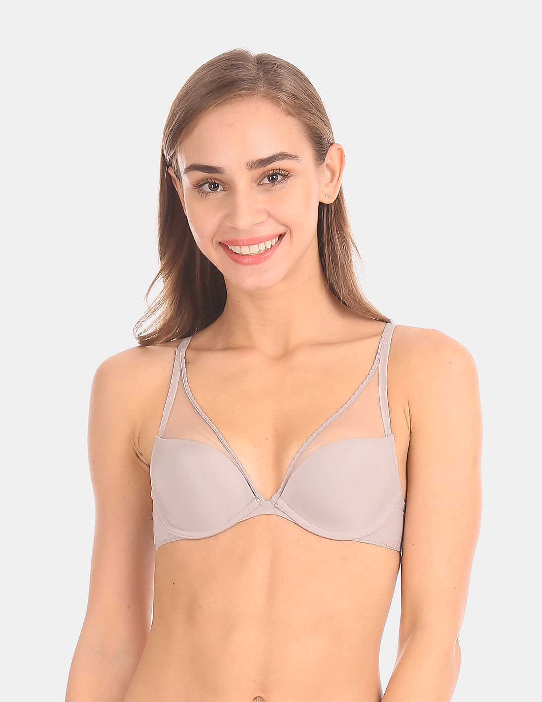 Women Grey Semi Sheer Panel Plunge Neck Bra