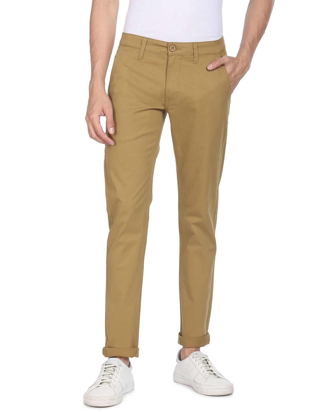 Khaki Mid Rise Solid Casual Trousers