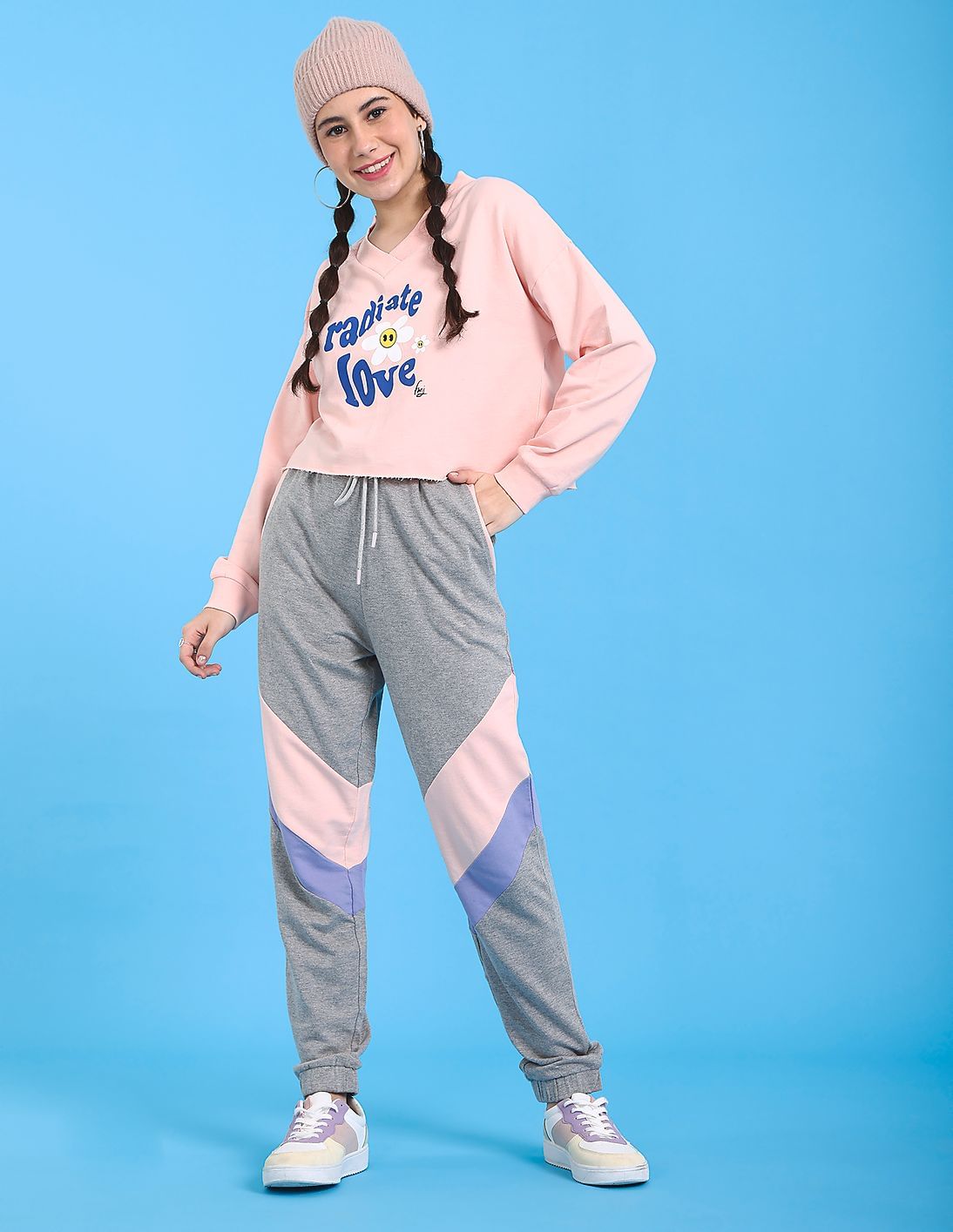 Ribbed V-Neck Graphic Print Cotton Sweatshirt