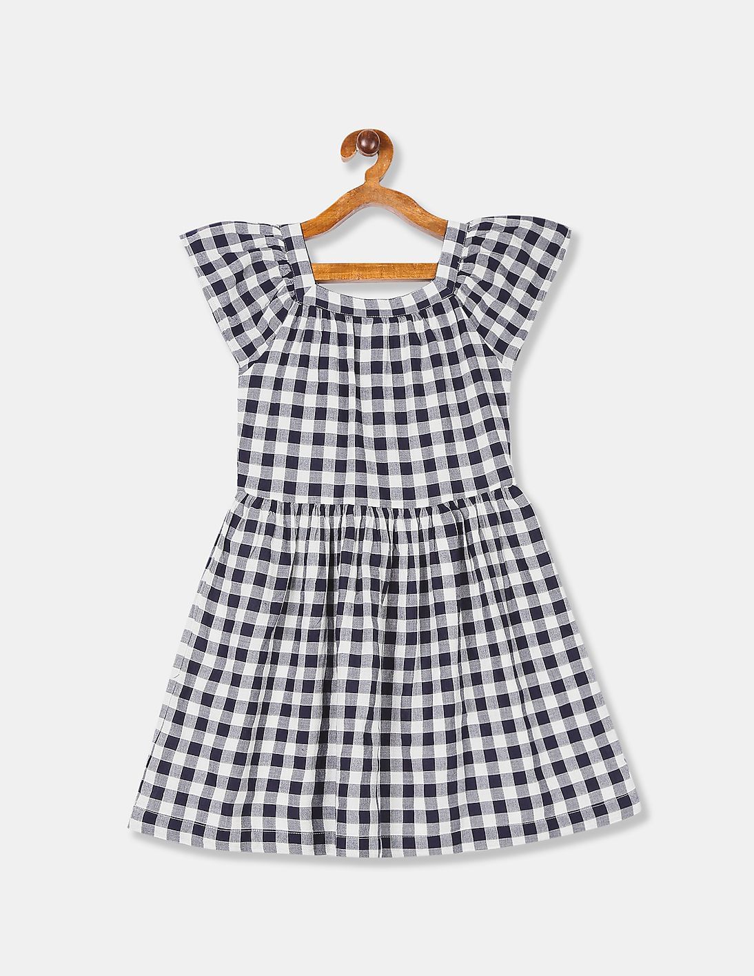 Girls Blue Gingham Square Neck Fit And Flare Dress