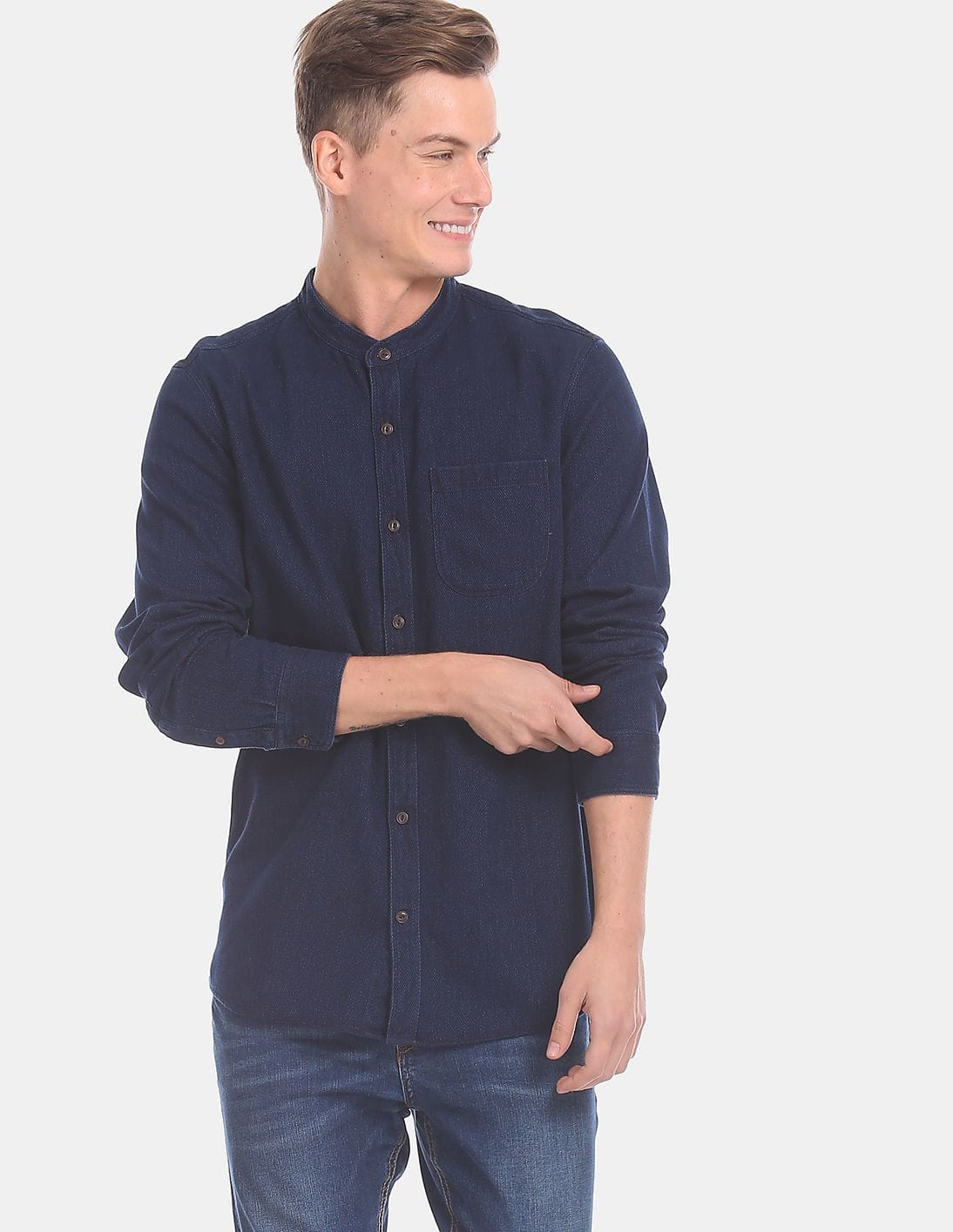 Men Blue Band Collar Long Sleeve Casual Dobby Shirt