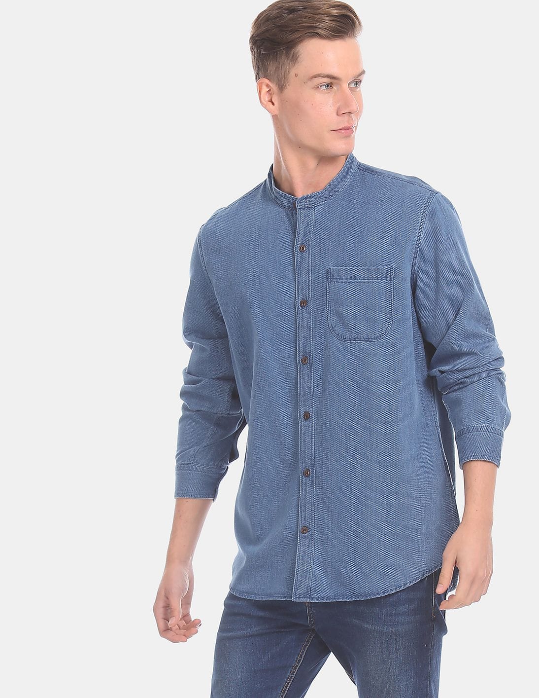 Men Blue Band Collar Long Sleeve Casual Dobby Shirt