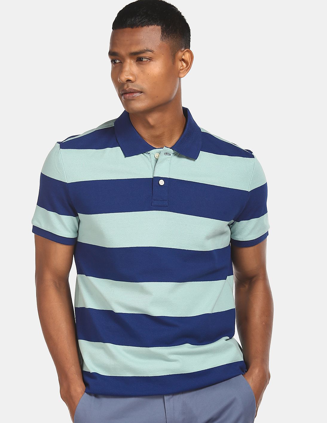 Men Blue Rugby Stripe Pique Polo Shirt In Stretch