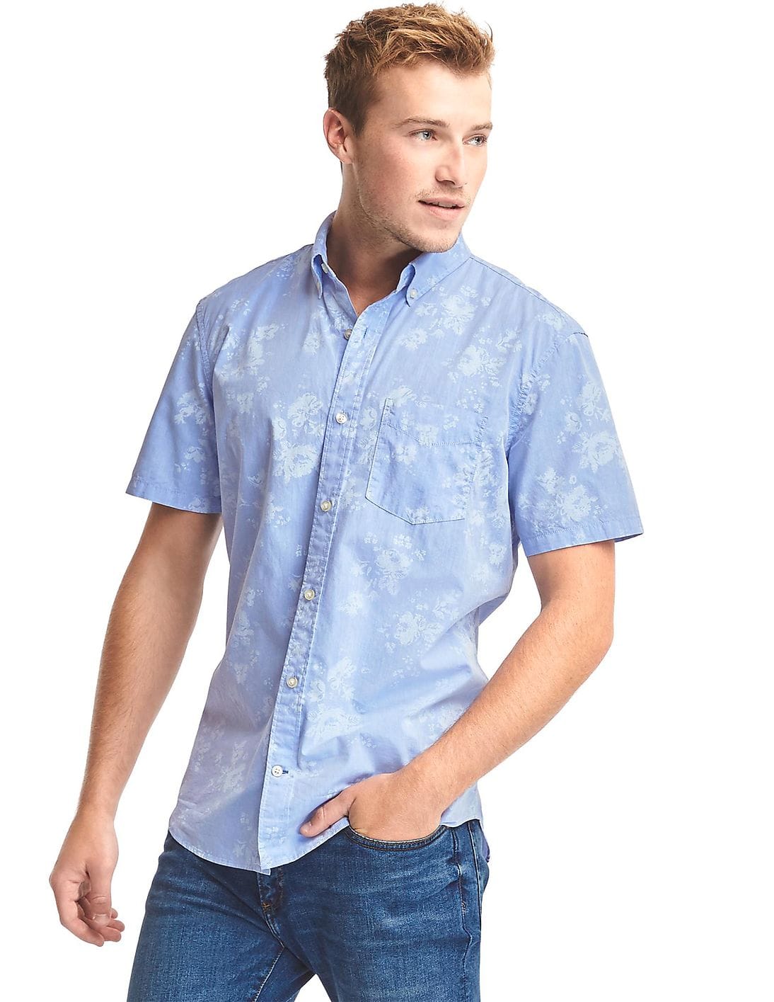 Men Blue True Wash Poplin Floral Short Sleeve Standard Fit Shirt