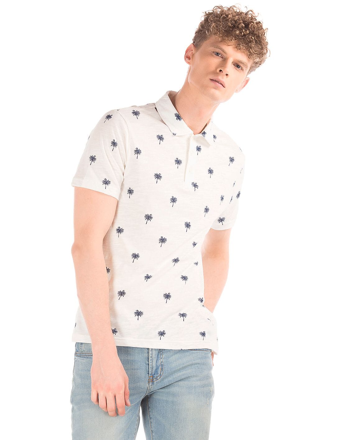 Men White Palm Tree Print Polo Shirt