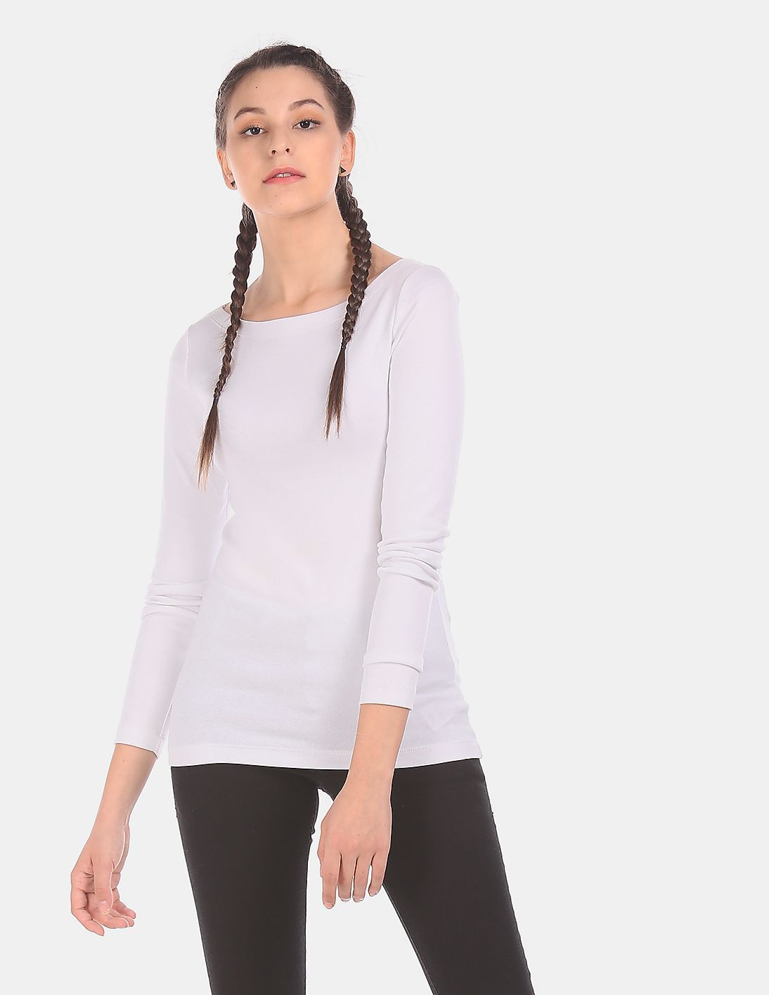 Women White Long Sleeve Modern Boat Neck T-Shirt
