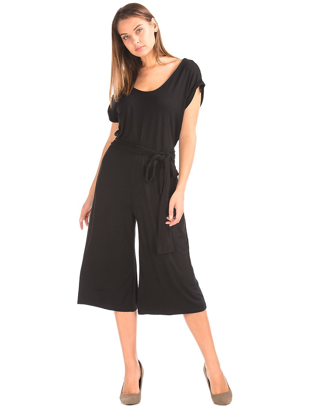 Women Black Wrap Belt Culotte Jumpsuit