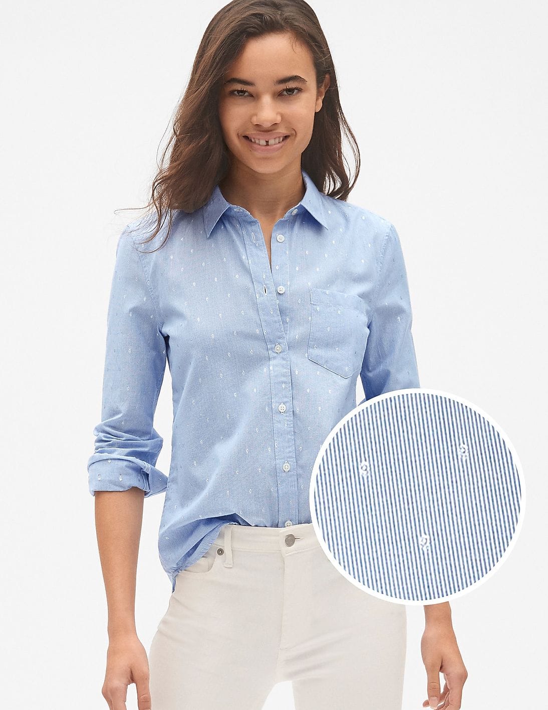 Women Blue Fitted Boyfriend Stripe Shirt in Metallic Clip Dot