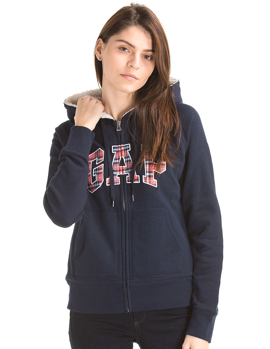 Women Blue Plaid Logo Sherpa Zip Hoodie