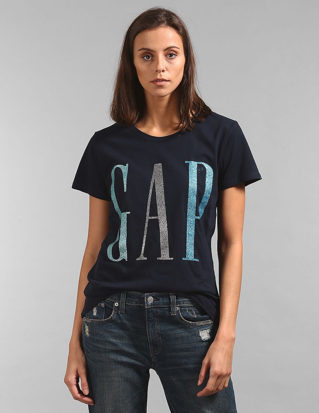 Women Blue Short Sleeve Glitter Print T-Shirt