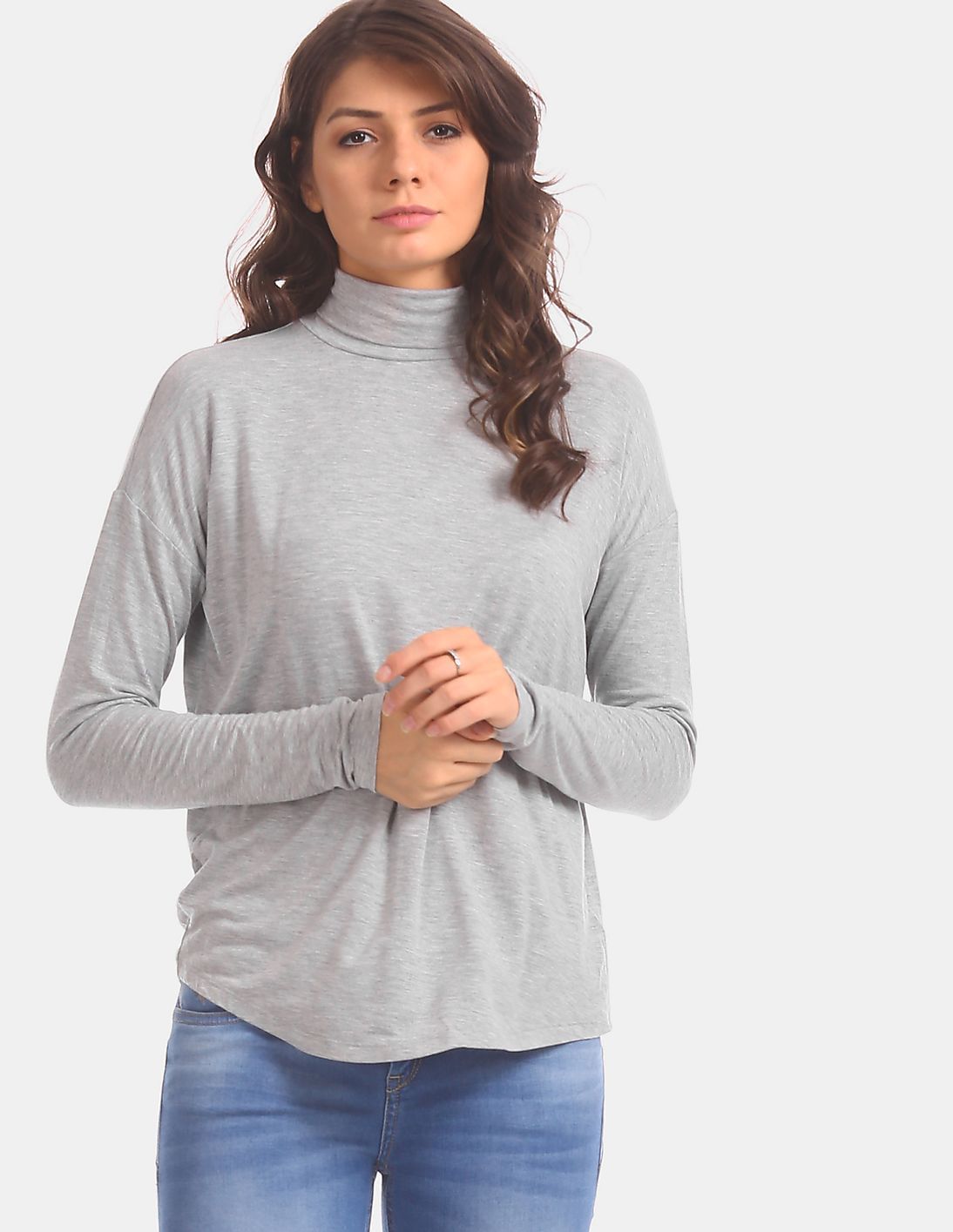Women Grey Long Sleeve Luxe Relaxed Turtleneck T-Shirt