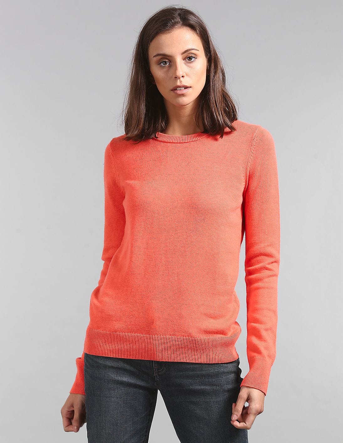 Women Orange Round Neck Full Sleeve Sweater