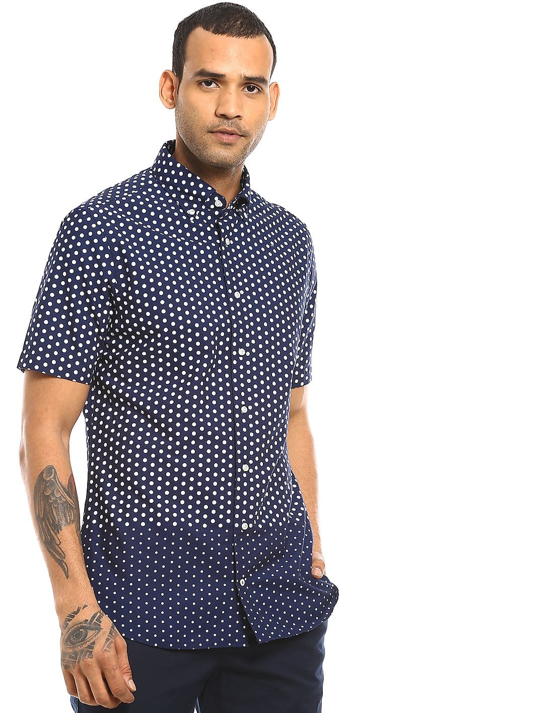 Men Navy Short Sleeve Polka Dot Print Casual Shirt