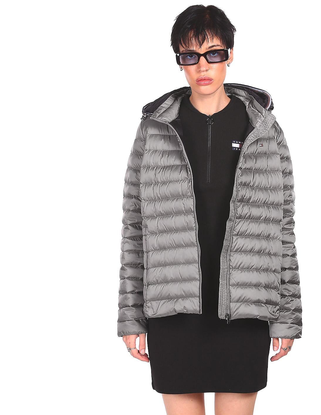 Women Silver Long Sleeve Solid Hood Jacket